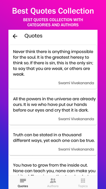 このアプリは、愛、モチベーション、友情、インスピレーション、政治、ユーモア、アート、音楽など、さまざまなカテゴリーを提供しています。多くの異なる引用があります。